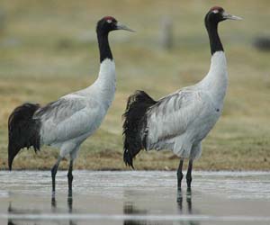 The black-necked crane (trhung-trhung) is a rare species found scattered in the Tibetan plateau, and is also found nesting in summer in parts of Ladakh. The Black-necked Crane, one of the most charismatic birds of Ladakh. It is whitish-gray, with a black head, red crown patch, black upper neck and legs, and white patch to the rear of the eye. It has black primaries and secondaries. Both sexes are similar. Some populations are known to make seasonal movements. It is revered in Buddhist traditions and culturally protected across much of its range.